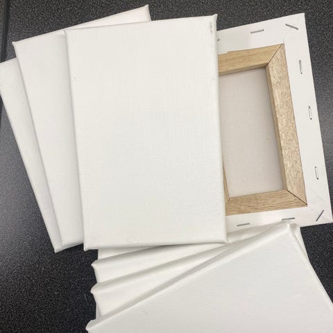 Sett med helt nytt uåpnet lerreter med maling og oppheng.