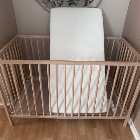 IKEA Sprinkelseng barneseng i tre. Sengen har en enkel og funksjonell design med naturlig trefinish. Egnet for små barn og gir en trygg soveplass med sprinkler rundt hele sengen.