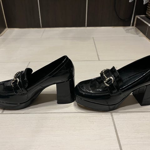 Svarte hæler med fluffy overdel. Prøvd 1 gang men passa de ikke. Lappen er på og har bare stått til «pynt»