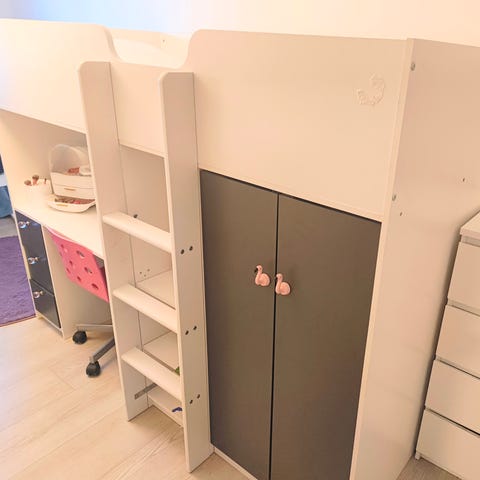 Praktisk og plassbesparende Swan Halvhøy seng med uttrekkbart skrivebord og god oppbevaringsplass. Perfekt løsning for barnerom eller rom med begrenset plass.