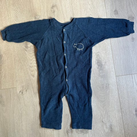 Nøstebarn heldress i størrelse 104 for barn, unisex. Ullfrottepysjamas. Fargen er hvit. Plagget har knapper foran for lukking. Det er merkbare slitasjer og hull på stoffet, se bilde av begge beina. Denne passer for noen som kan lappe igjen hullene eller klippe av beina å sy en kant. Mye bruk igjen i pysjamasen ellers.