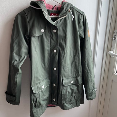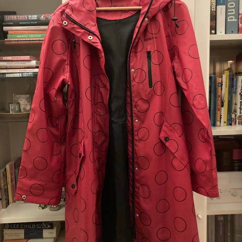 • Regnjakke fra Fair Lady, str. 40. Brukt kun 2 ganger, som ny. Vanntett med glidelås, hette og innvendig fôr.