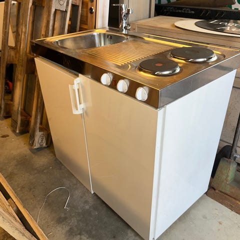 Lite brukt Culina minikjøkken fra Intra med moderne komfyrtopp og stor vask. Praktisk våtsone med plass til skjærefjøl som kan skyves fra våtsonen og over kummen. Leveres med metallskap, kjøleskap, vask og platetopp med 60 min timer. Det finnes tilbehør spesielt designet til kjøkkenkummen.