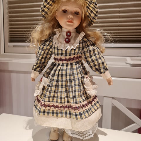 Håndmalt dukke i porselen, kledd i grønn fløyelsdrakt bestående av jakke, bukse,sko og lue. Dukken har malt ansikt med detaljerte øyne og lepper, samt lyst hår. Passer til samling eller dekorasjon.stativ følger med