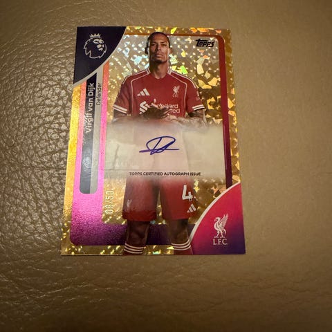 Topps Premier League 2025/26 Virgil van Dijk Autograph Base Players Variation Kort. Fotballkort med autograf av Virgil van Dijk, forsvarer for Liverpool FC. Kortet er en del av Premier League-sesongen 2025/26 og har autentisert signatur bekreftet av Topps.