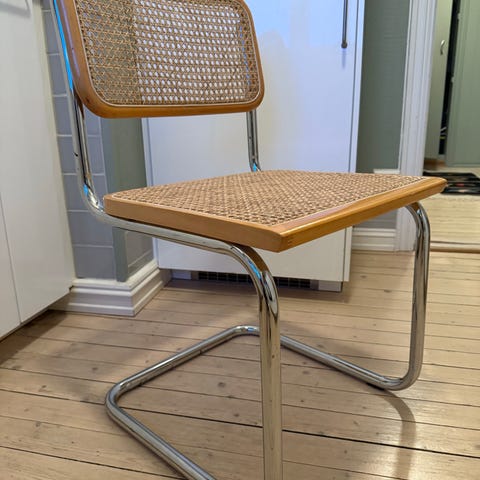 En pen stol til spisestuen, kontorepulten, sminkebordet e.l. fra den spanske leverandøren av kvalitetsmøbler, Manuel Larraga. Den er trukket i et lyst og slitesterkt tekstil med struktur, Gancedo bay, med grå/ sorte eikeben, setedybde 43 og setehøyde 47 cm
