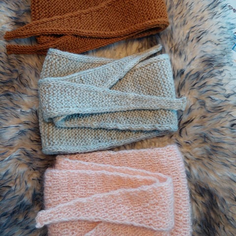 Strikket i Dale Garn myk påfugl i lys gul og gammelrosa.