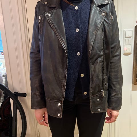 Strikket på tynne pinner, derav er den er veldig tynn og føles lett å ha på seg,