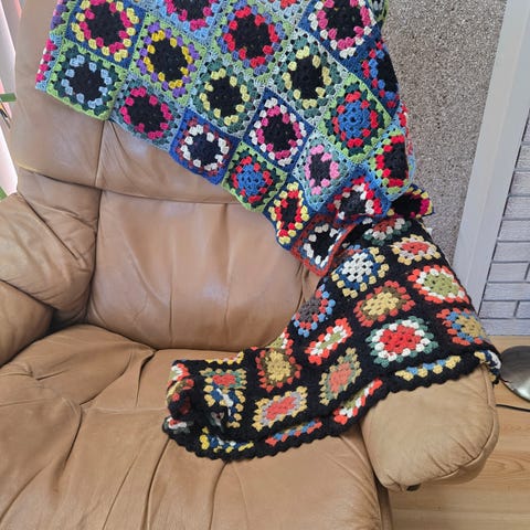Et fargerikt, nydelig heklet pledd med bestemorsruter. Kan brukes som pledd eller som dekorativt sengeteppe. Ca 110x180 cm.