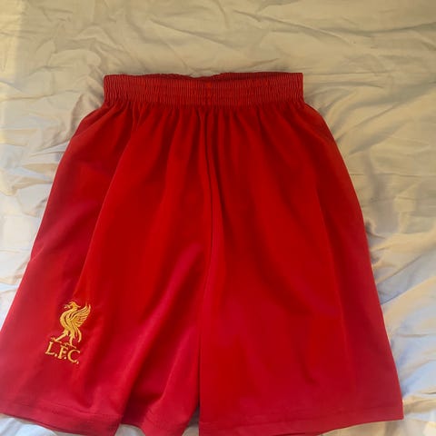 Original Liverpool Fotballshorts i størrelse M, farge rød med hvite detaljer selges.Laget av lett og pustende materiale med elastisk midje og snor for justering. Designet for fotballbruk.Brukt en gang,selges grunnet feil størrelse.