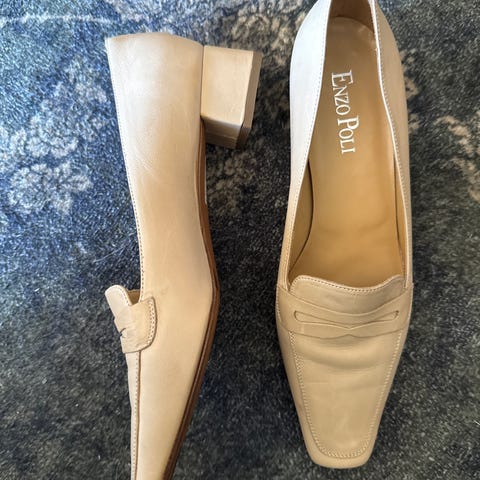 Högl mokkasiner og båtsko i størrelse 39. Laget av hvitt skinn med en lav blokkhæl i trefarget utførelse. Skoene har en glatt overflate med sømdetaljer og en komfortabel innersåle. Egnet for daglig bruk og formelle anledninger.