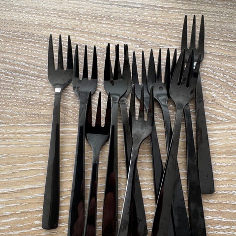 Selger sett med bestikk i svart/metall. Det følger med gafler, te skjeer og spiseskjeer, samt svart kakespade og pasta/sleiver. Kniver følger ikke med. Brukt, men fine bruksmerker. Alt er fortsatt brukbart til hverdags, selges som det er.