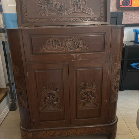 Selger et fantastisk barskap i heltre eik med utsøkte detaljer og skjulte funksjoner. Speilet med samme mønster følger med. Lagt i England av kjent firma Jancee Furniture Ltd.