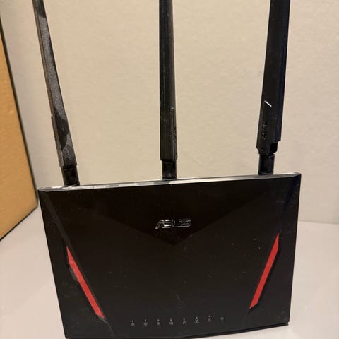 ASUS RT-AC68U Router med svart farge. En trådløs ruter med flere antenner for forbedret signalstyrke og rekkevidde. Utstyrt med flere LAN-porter for kablet tilkobling. Passer til hjemme- og kontornettverk for trådløs internettforbindelse. Pent brukt.