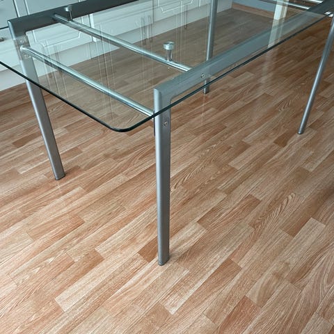 Selger et bord med metallben og glasstopp. Er brukt og fungerer fint som det er. Er demontert og enkelt å ta med seg. Plass til 4 rundt bordet eller brukes som pult.