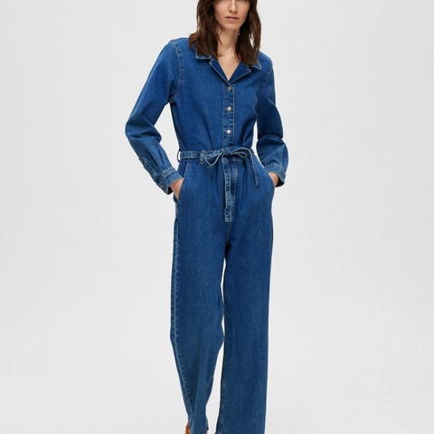 Stilig damejumpsuit, tynt denimstoff, justerbar linning med snøring, størrelse M, ville vært for stor for en størrelse S
