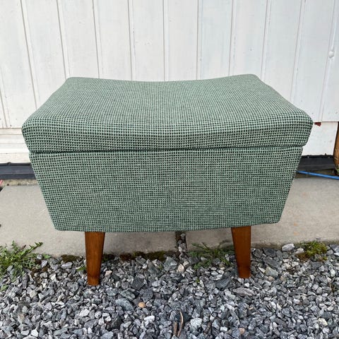 Gammel fotskammel med oppbevaringsplass. Målene er 37cm dyp, 50 cm bred og 40 cm høy.