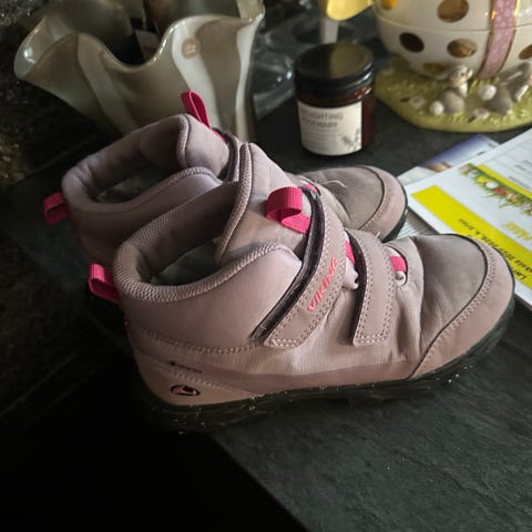 Nike barnesko for jente i størrelse 34. Skoene er rosa med hvite detaljer og har snøring. Egnet for daglig bruk og utendørs aktiviteter.