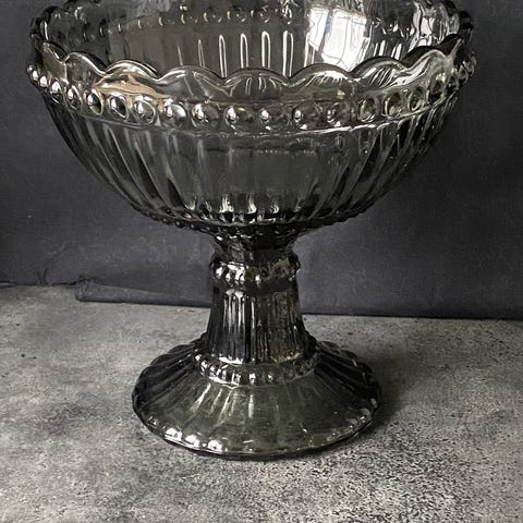 Iittala Marimekko glasskål i grå glass. Skålen har en dekorativ design med mønster og en fotet base. Egnet til servering eller dekorative formål.