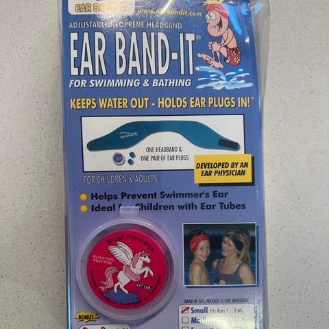 Ear Band-it med ørepropper. Forebygger ørebetennelse hos barn. Øreproppene er ikke brukt.