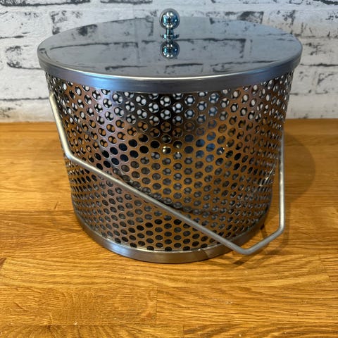 Coghlan's Corn Popper popcorngryte med håndtak for bruk over åpen ild eller bål. Laget av metall med hull for jevn varmefordeling. Designet for å poppe maiskorn til popcorn utendørs.