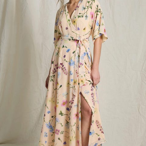 En printet maxikjole fra Malina med lange vid ermer. Kjolen har elegant knyting med sløyfe i ryggen for en feminin og ettersittende look. Den perfekte kjolen til våren og sommerens festligheter.