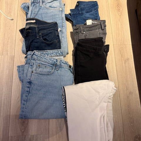 Selger tre pene jeansbukser i blått og svart, i størrelse S og M.
