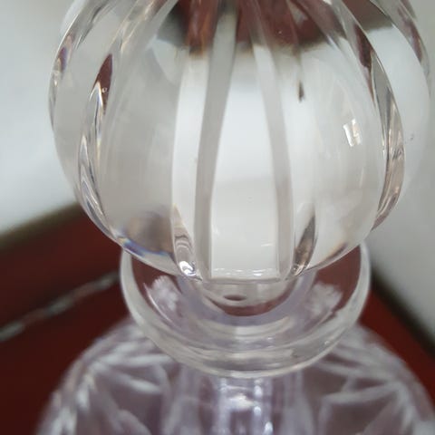 LYSESTAKE, MEGET FIN. Høyde 13,5 cm, foten er 8-kantet, bredde 7,5 cm, er også 8-kantet oppe, 4,5 cm, veier 380 gram. Vet ikke om det er krystall, eller glass. MEGET FIN! Den er i klart kraftig glass/krystall. Helt enkel, kun 8-kantet fot også øverst.