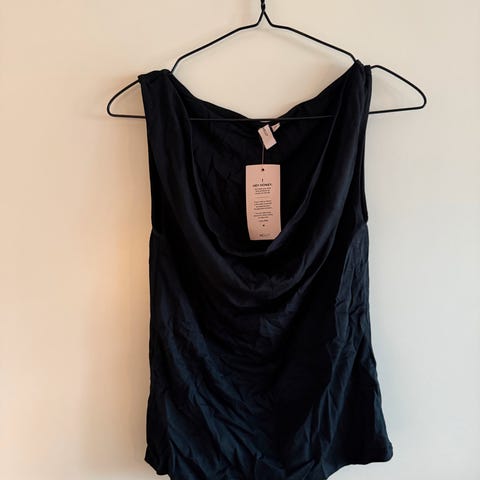 Svart singlet med maljer på brystet. Fra Nelly, størrelse L. V-utringning både foran og bak. Liten splitt i sidene.