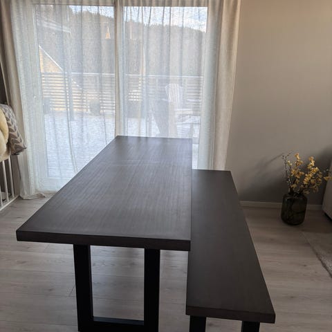 Overbygd piknikbord i tre med benker på begge sider. Konstruksjonen er i beiset/brunfarget treverk med tak som gir ly for sol og nedbør. Bordet har integrerte sittebenker festet til rammen. Egner seg for uteplass, hage, park eller hytteområde der man ønsker en fast sittegruppe med tak. Står på solid ramme som kan plasseres direkte på fast underlag utendørs.