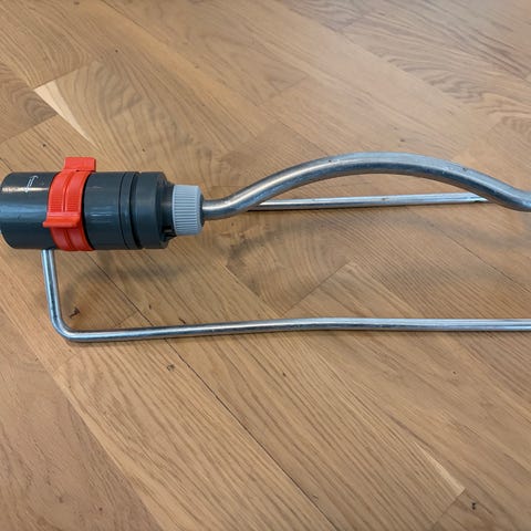 Gardena Sprinkler vanningsutstyr i gul og sølvfarget plast og metall. Designet for å dekke hageområder med jevn vannfordeling. Utstyret inkluderer justerbare innstillinger for vannstråle og dekning. Passer til standard hageslanger med vanlig tilkobling.