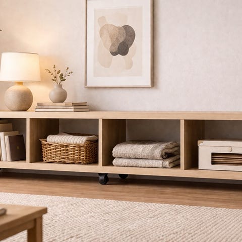 Denne oppbevaringskisten i tre med hjul er en ideell oppbevaringsløsning for oppholdsrommet.