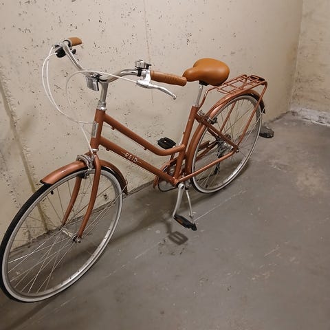 Peugeot Dame Bysykkel i Perlehvit/Sølvfarge. Sykkelen har en klassisk ramme med lav innstigning, egnet for damebruk. Utstyrt med bagasjebrett, støtte, og tradisjonell ringeklokke. Passer for bysykling og hverdagsbruk.