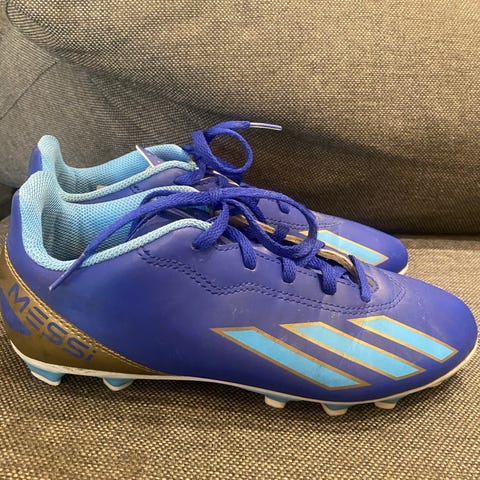 Adidas Messi fotballsko i blå farge, størrelse 36. Skoene har knotter for bruk på gressbaner og er laget for barn. Materialet er syntetisk med tekstilfôr, designet for fotballspillere.
