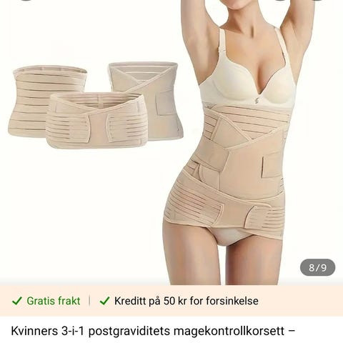 Selger min 3-in-1 Postpartum Recovery Magestrammer i svart, designet for kvinner etter fødsel. Produktet gir støtte til mage og midje, fremmer riktig holdning og kan bidra til å lindre ryggsmerter. Har vært viktig for ryggen min og bekkenet mitt i tiden etter fødsel.