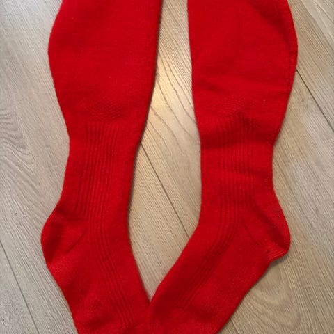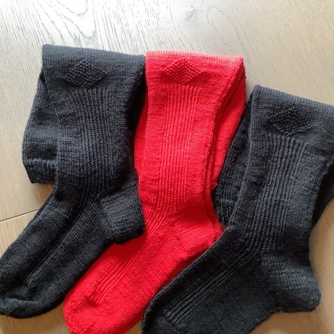 De er strikket på pinne 2 og 2 1/2. Passer str 37-39. Leggen er strikket litt videre enn oppskriften tilsier. Sokkene er nye og ubrukte.