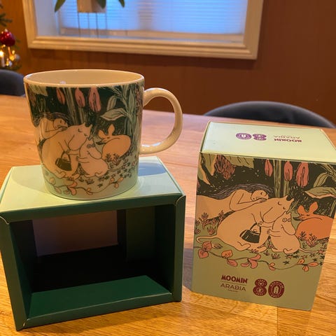 Arabia Mummi 80-års Jubileum Kopp med Mummitrollet design. Koppene er laget i porselen og har dekorative illustrasjoner fra Mummifamilien med grønt og rosa fargevalg. Egnet for daglig bruk som drikkekopp.