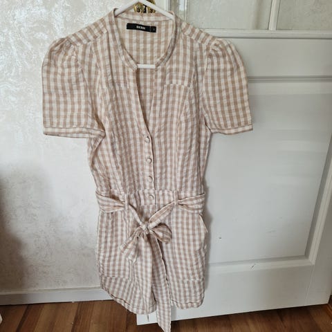 Beige jumpsuit fra Gina tricot. Ikke brukt, kun prøvd på, men lappen revet av og bare litt hengende i skapet. Derfor selges den. Ingen skader/merker.