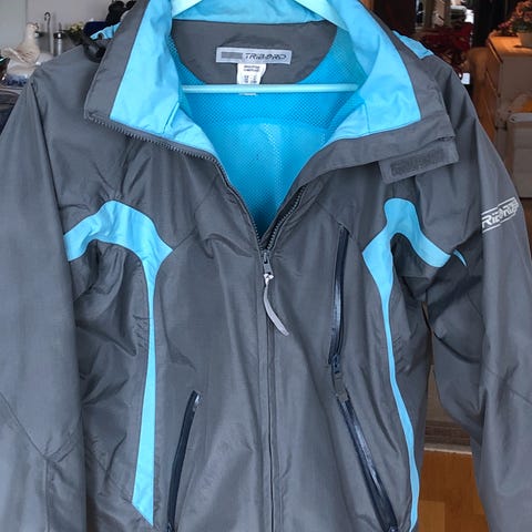 Tynn parkas/regnponcho selges fordi den er for liten. Stramming i livet og lommer med knapper. Disse har riktignok falt ut, men jeg synes det går helt fint å bruke jakken likevel.