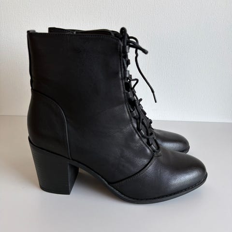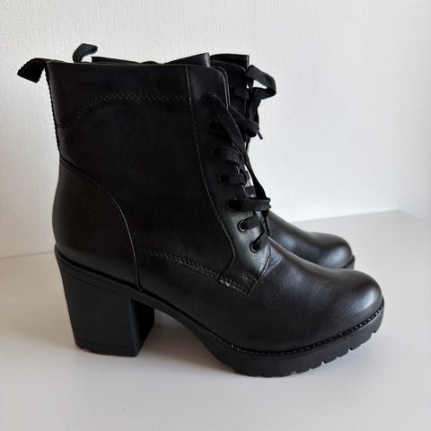 Marco Tozzi svart kunstig skinn sko med snor og glidelås på siden. Fin og god kvalitet. Følger med emballasje/eske. Helt nye, ubrukt. Skoene er str 40. Org. pris 2499,-kr
