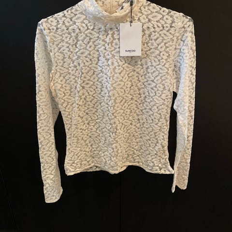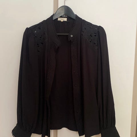 Denimbluse med volanger fra Suncoo Paris. Lys denimfarge med hvite knappedetaljer på ermene og kragen. Laget av 100% FSC Lyocell. Normal størrelse. Jeg har str L.