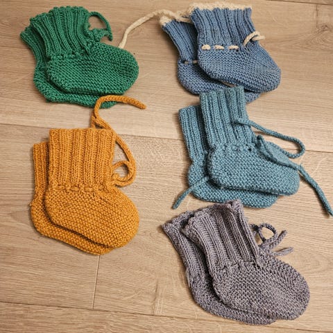 Votter og tøfler i babystørrelse, strikket I Merino Extra Fine, fra Drops. Pakket i cellofan som gave.