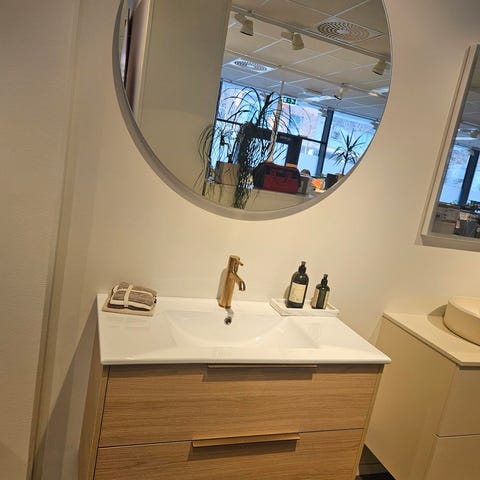 Vi skifter ut flere av våre utstillinger, og selger Dansani Inzo utstillingsmodell til sterkt redusert pris. Ordinær pris kr. 31.930,-. Selges til kr. 17.560,-. Møbelet består av 100cm underdel i nordisk eik med heldekkende Kantate porselensservant. 90cm Corona bakbelyst speil er også inkludert. Møbelet har push-open skuffer uten påmonterte håndtak. Skuffeinnredning og stikkontakt i nedre skuff er inkludert.