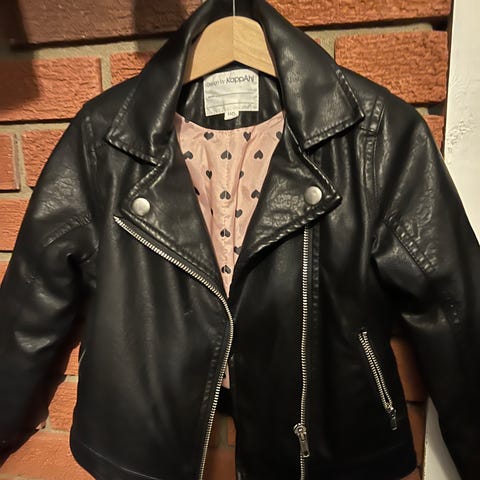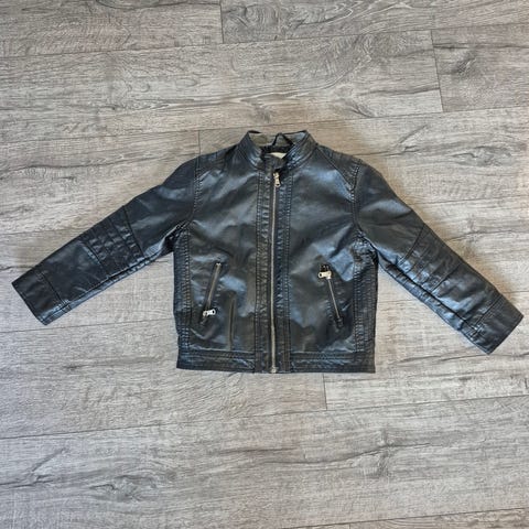 Primark skinnjakke for barn i størrelse 110. Jakken er svart og laget for jenter. Den har glidelåslukking og lommer med glidelås.