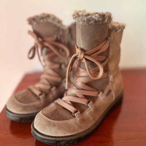 Varme og lette vintersko med praktisk snøring og godt grep i sålen. Brukt en sesong av ett barn før de ble for små. Slitasje på lisser/strikk, ellers hele og pene