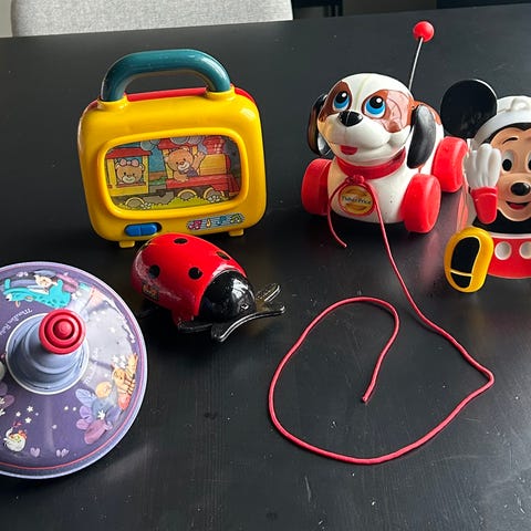 Rydder i kjelleren, har kommet over en boks med babyleker som jeg ikke har plass til. Lekene er hele og pene, har mye tid igjen. De nærmer seg vel retro 😊