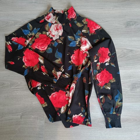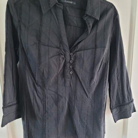 Pen og enkel svart bluse fra Byoung. Den har glidelås i ryggen og knappedetalj i ermene. Pent brukt men knappene er ikke like fine lenger, dette synes veldig lite på avstand. Kan fint passe en størrelse S også.