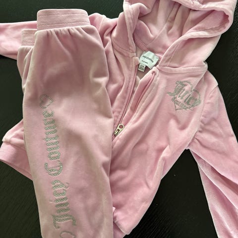 Grå merker på kne og framme på buksa ved høgre lomme. Merka er litt tydegare på bilda enn i verkelegheita, spesielt det ved lommen. Kleda har mista litt elastikk i ribben ved anklar, handledd og nedst på jakka.