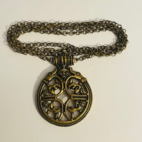 Utrolig fint bronse smykke med flott kjede. Mener det er Finsk. Klarer ikke tyde stempel bak.