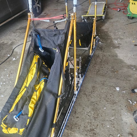 Robust Dyckvogn selges. Selges da vi ikke lenger kjører hundespann. Skivebremser bak, trommelbremser foran. Fotbrems